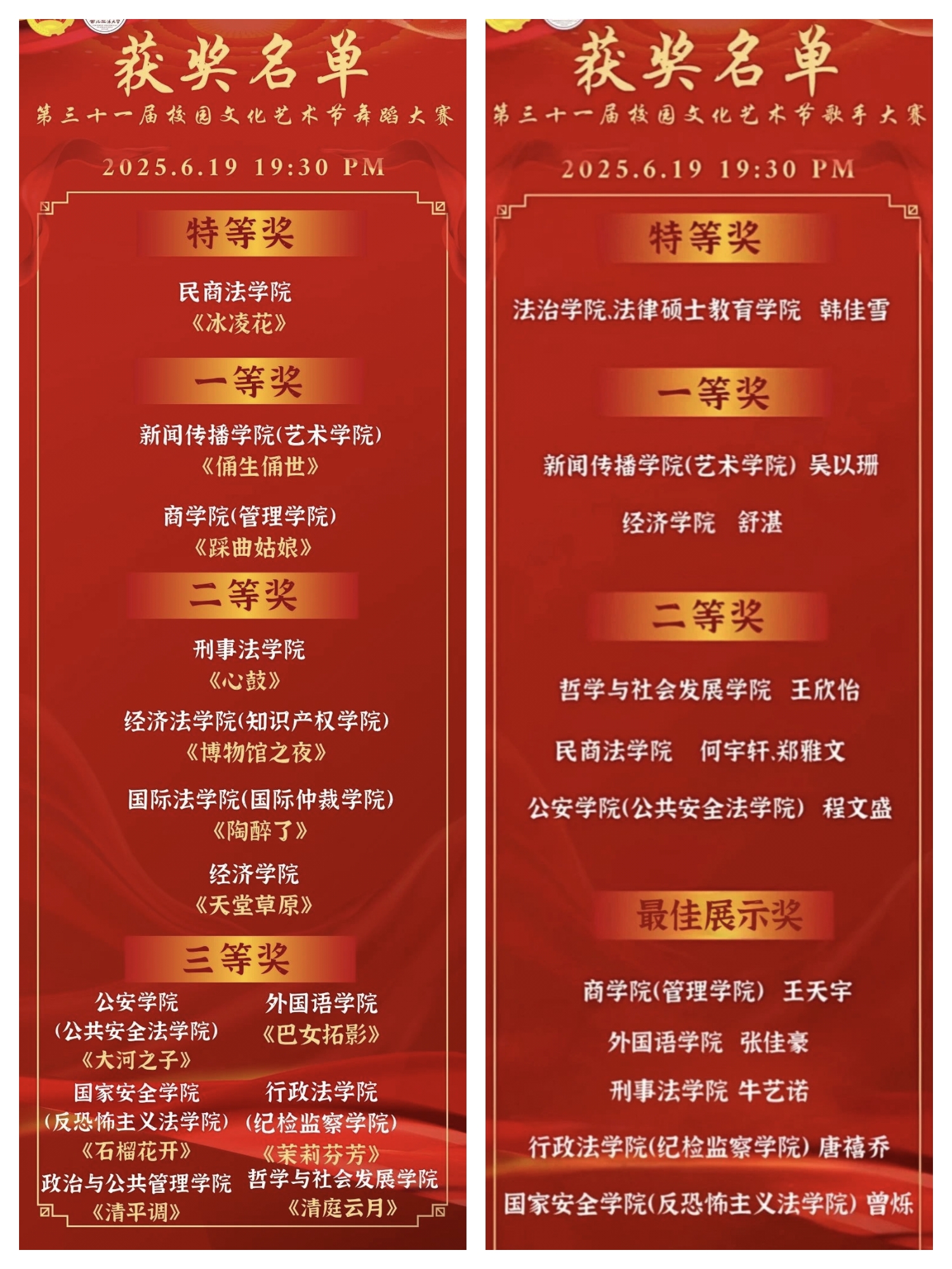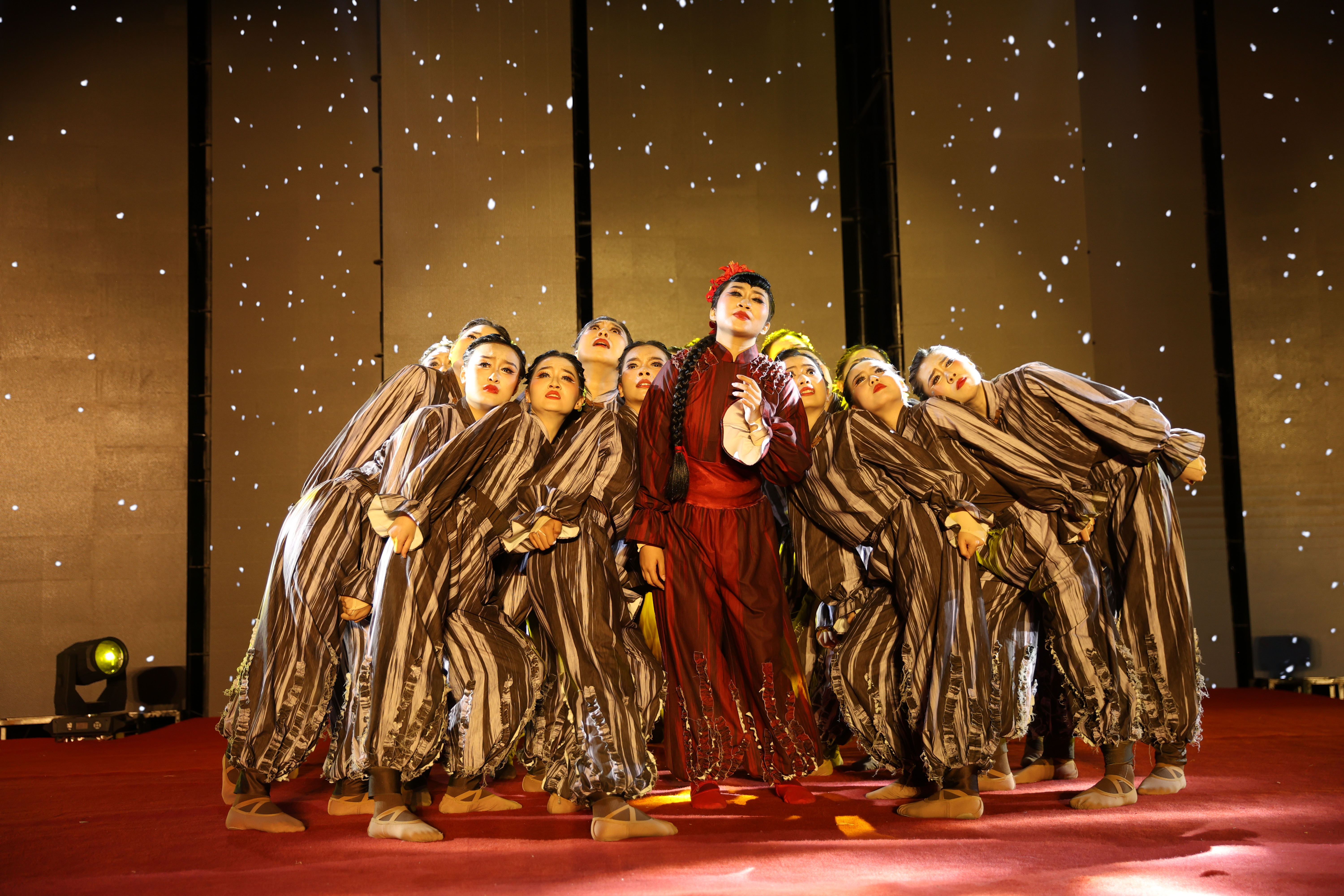 舞蹈展演中,各学院以灵动舞姿勾勒多彩画卷。行政法学院(纪检监察学院)的《茉莉芬芳》寄托爱国深情;外国语学院的《巴女踏影》融合地域灵秀与青春朝气;《陶醉了》《清庭云月》等舞蹈或展现民族风情,或勾勒山水诗意;刑事法学院的《心鼓》气势磅礴,奏响生命强音;《石榴花开》《大河之子》等作品诠释民族团结与理想信念;《俑生俑世》《博物馆之夜》则穿越时空,唤醒历史记忆;《天堂草原》《踩曲姑娘》《冰凌花》等以各具特色的舞步,演绎不同场景下的坚韧与浪漫,尽显舞蹈艺术的魅力与生命力。