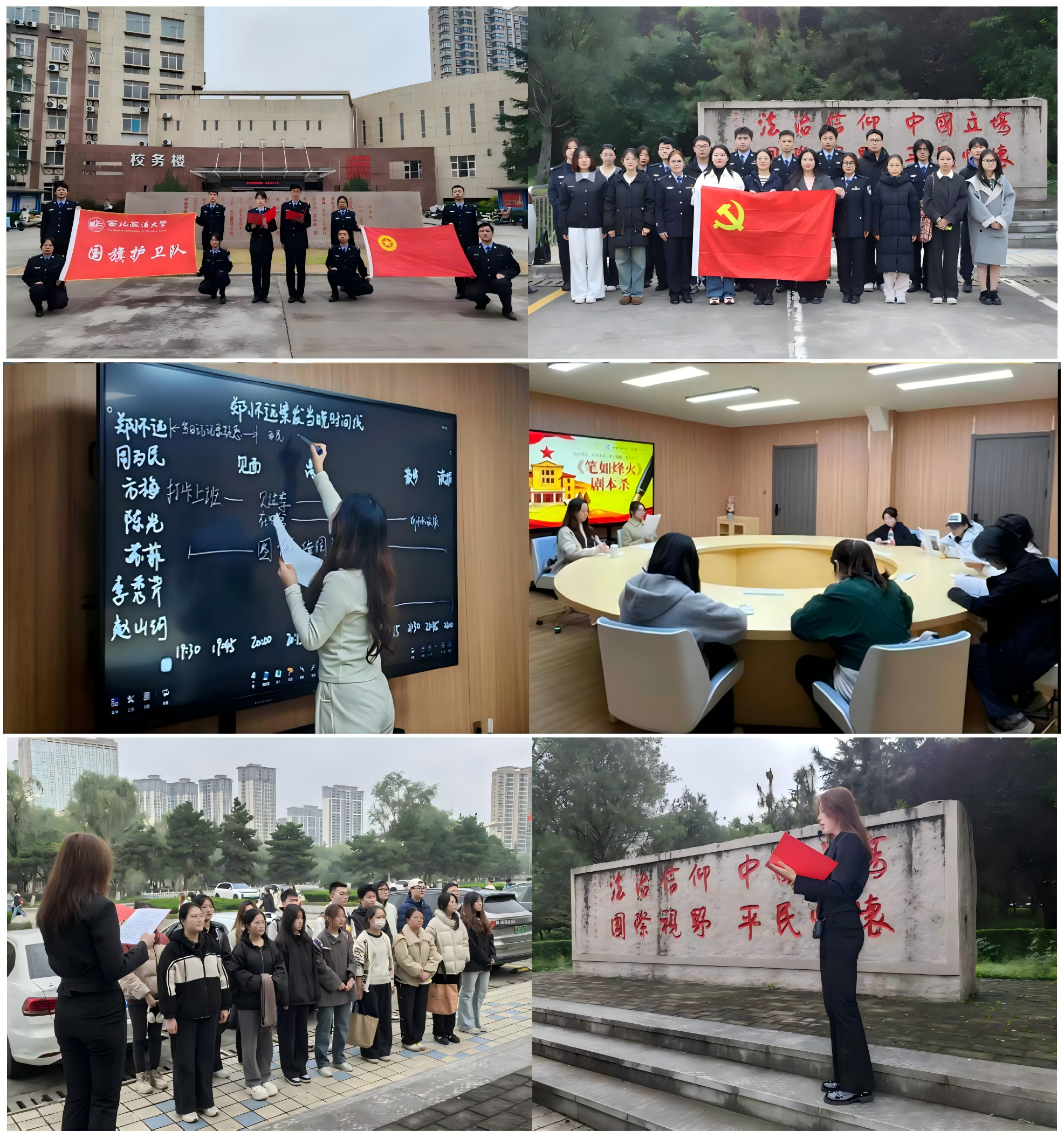 各学院立足专业特色,开展系列特色活动:哲学与社会发展学院以团支部为单位,通过学习英雄事迹、观看党史纪录片开展专题团课;经济法学院(知识产权学院)组织主题班会,融入红色影片观看、校友故事分享与校史知识答题环节;国家安全学院(反恐怖主义法学院)赴革命纪念馆开展主题党日活动,并举办《献礼西法大》主题宣讲;政治与公共管理学院组织师生观看红色影片,同步召开交流座谈会;公安学院(公共安全法学院)开展主题团日、党日活动,进一步强化师生理想信念;新闻传播学院(艺术学院)组织诵读重要论述,创新推出“笔如烽火”沉浸式红色剧本杀;商学院(管理学院)举办校史知识互动答题活动,激发师生参与热情。
