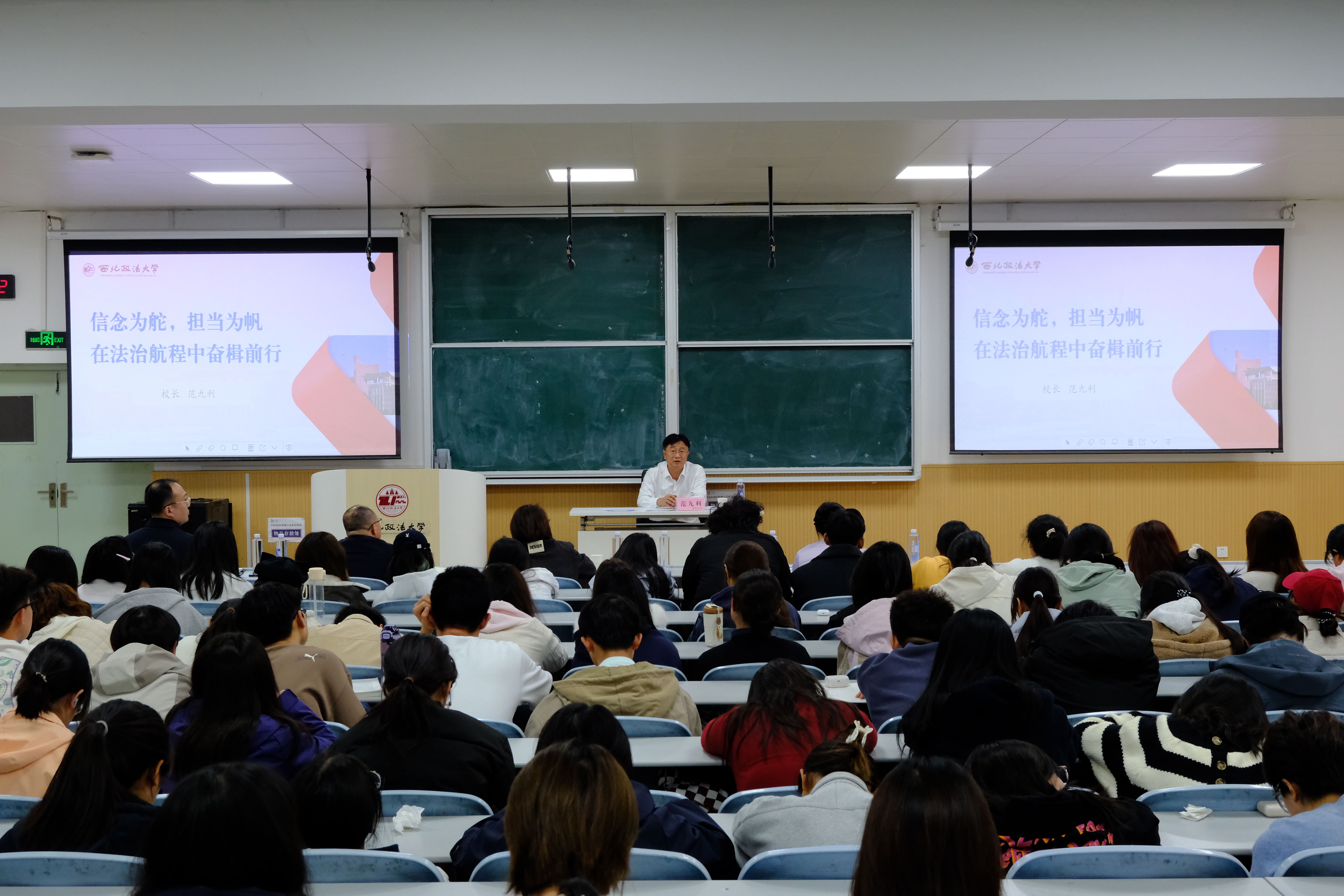 11月12日,校长范九利在长安校区AJ12教室,围绕“立法治信仰・育卓越才能・绘人生蓝图”主题,为民商法学院、经济法学院(知识产权学院)2025级新生代表讲授专题思政课。