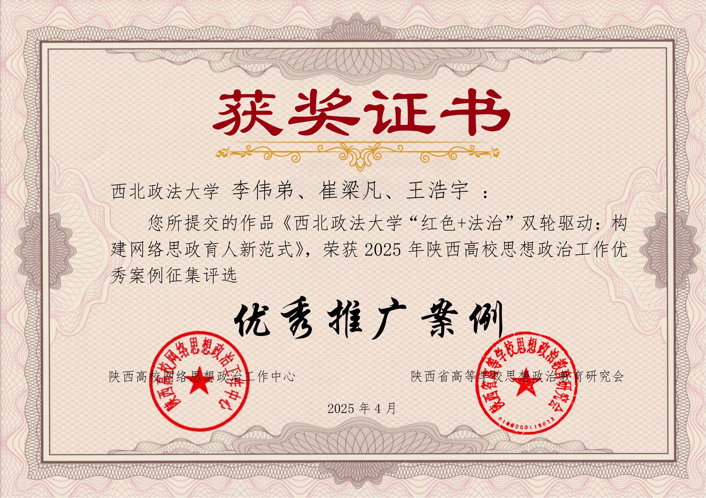 近日,在陕西高校网络思想政治工作中心、陕西省高等学校思想政治教育研究会面向全省高校举办的2025年陕西高校思想政治工作案例征集活动中,beat365报送的《beat365平台官方网站“红色+法治”双轮驱动:构建网络思政育人新范式》荣获陕西高校思想政治工作优秀推广案例。案例由党委学工部(学生处)李伟弟副教授、新闻传播学院(艺术学院)辅导员崔梁凡、刑事法学院辅导员王浩宇撰写。