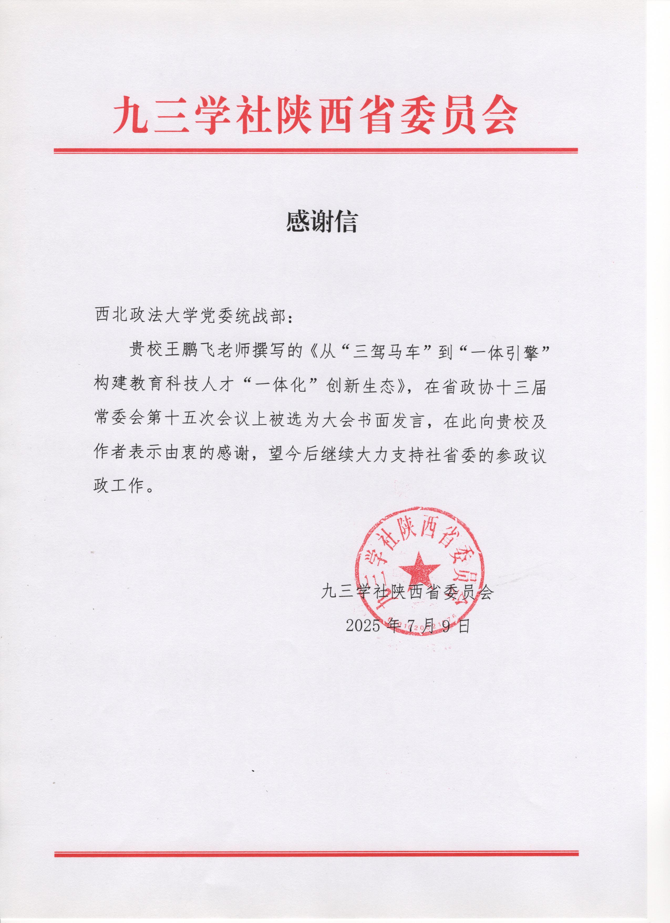 近日,九三学社beat365平台官方网站支社主委王鹏飞撰写的文章《从“三驾马车”到“一体引擎”构建教育科技人才“一体化”创新生态》在省政协十三届常委会第十五次会议上被选为大会书面发言,九三学社陕西省委员会向党委统战部发来感谢信,并希望今后继续支持社省委的参政议政工作。