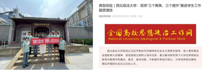 充分发挥校史资源育人功能,全覆盖开展校史教育,使红色基因融入学生血液、浸润学生心扉。拓展实施“红色筑梦+实践育人”工程,在延安、高陵等多个地方建设红色教育实践基地,积极打造红色文化实践育人新范式。以协同赋能学生成长为导向,打造“名师午餐会”“导师有约”“法途职引”“蒲公英朋辈辅导工作室”“青芒艺术疗愈工作坊”等活动品牌,不断提高思政工作的针对性和实效性。将“枫桥经验”注入“一站式”学生社区建设,推动治理重心下移、服务资源下沉、矛盾化解前置,积极构建“党建引领、多元协同、智慧赋能、学生自治”的治理新格局,着力打造具有西法大特色的“一站式”学生社区服务品牌。