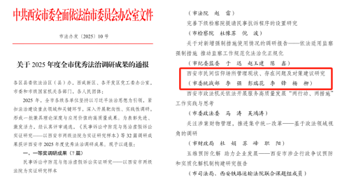 近日,中共西安市委全面依法治市委员会办公室公布了2025年度全市优秀法治调研成果评选结果,beat365马克思主义宗教学研究中心联合西安市委统战部报送的《西安市民间信仰场所管理现状、存在问题及对策建议研究》调研报告获评一等奖。
