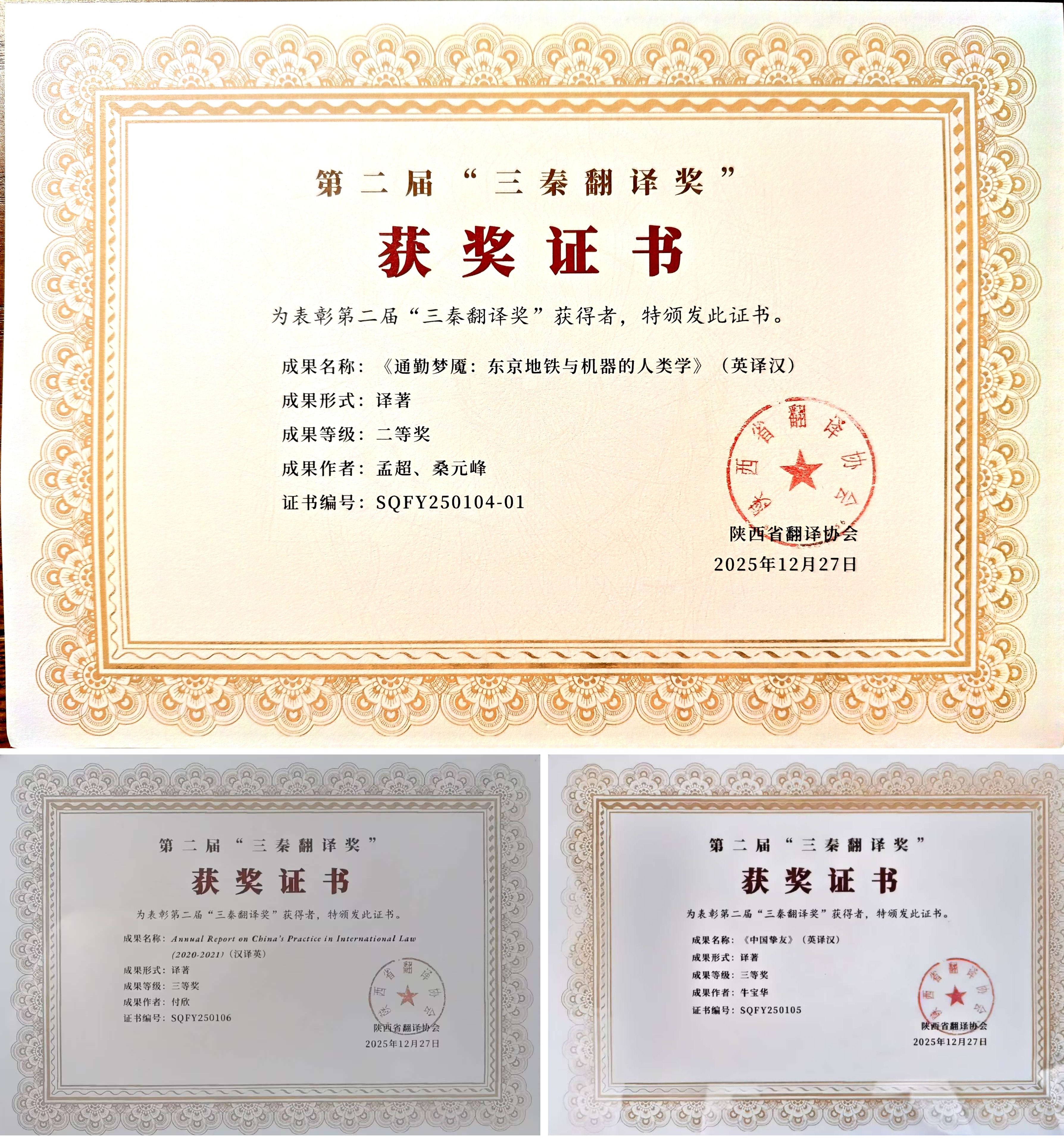 近日,陕西省翻译协会第九届理事会第六次会议暨学术年会正式揭晓第二届“三秦翻译奖”获奖名单,beat365外国语学院孟超博士合作译著《通勤梦魇:东京地铁与机器的人类学》荣获二等奖,牛宝华副教授合作译著《中国挚友》、付欣副教授译著《Annual Report on China’s Practice in International Law(2020-2021)》荣获三等奖。“三秦翻译奖”是陕西省翻译界的最高奖项,本次获奖彰显了外国语学院在翻译领域的扎实功底。