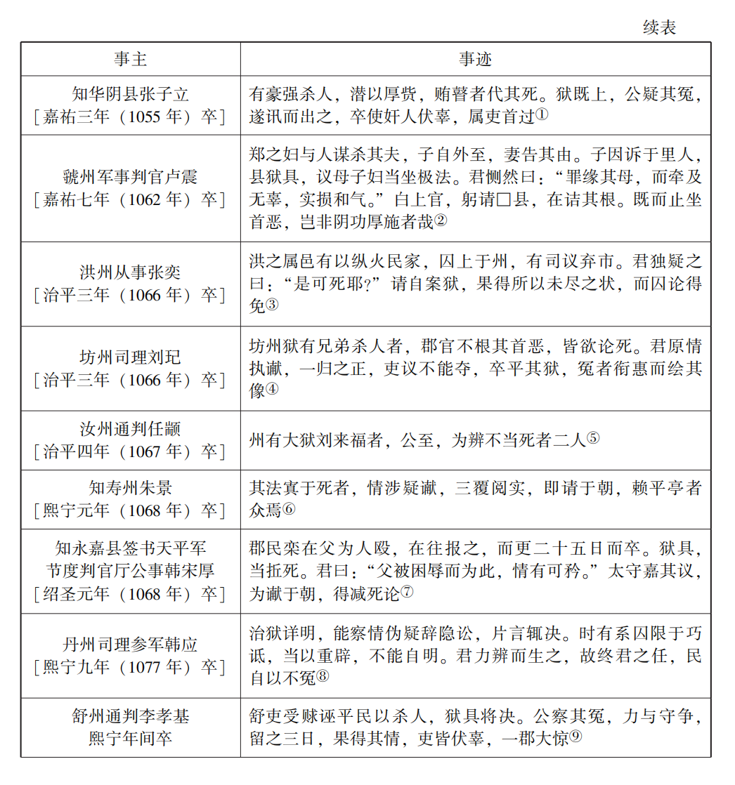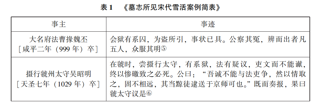 显而易见,雪活酬赏目的在于通过官吏详察案情,达到消除冤狱、慎刑止杀的目的。雪活人命被视为官僚重要德政治迹,部分雪活事例得以著于史籍、墓志之中(参阅表1《墓志所见宋代雪活案例简表》)。譬如,任颛[治平四年(1067年)卒]通判汝州,“州有大狱刘来福者,公至,为辨不当死者二人。”绍圣初年,乔执中以宝文阁待制知郓州,“执中宽厚有仁心,屡典刑狱,雪活以百数。”名臣范百禄之子范祖述“监颖州酒税,摄狱掾,阅具狱,活两死囚,州人以为神。”依据宋代司法惯例,雪活人命者应获得朝廷奖赏,与此同时,原审法官应承担相应法律责任。由此,针对雪活酬赏,出现庸吏滥用和良吏弃用两项截然对立的司法倾向。