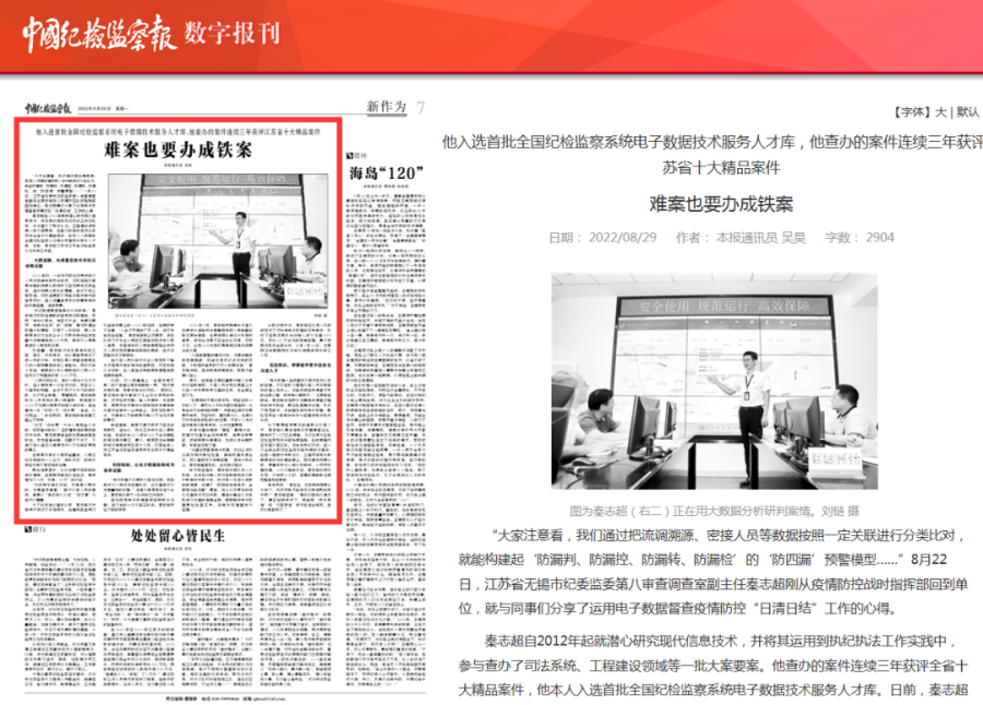 秦志超自2012年起就潜心研究现代信息技术,并将其运用到执纪执法工作实践中,参与查办了司法系统、工程建设领域等一批大案要案。他查办的案件连续三年获评全省十大精品案件,他本人入选首批全国纪检监察系统电子数据技术服务人才库。日前,秦志超又获评江苏省纪检监察系统先进工作者。