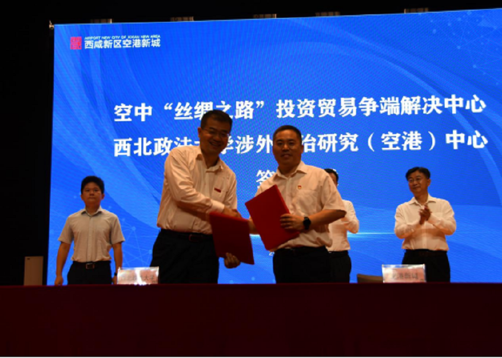 会议议程分为第一阶段:空港新城稳增长、促发展暨重点项目签约大会,第二阶段:空港新城七一表彰大会。在第一阶段临空涉外中心揭牌仪式上,范九利作了重要致辞。认为西咸新区空港新城作为西北地区唯一、全国第6个空港型国家物流枢纽,近年来持续提升西安国际航空枢纽能级,不仅助推各类生产要素快速流动,还带动各类产业群迅猛发展,而即将在此成立的beat365平台官方网站涉外法治研究(空港)中心和“空中丝绸之路”投资贸易争端解决中心意义重大、影响深远。作为国家级涉外法治研究基地的实务拓展平台,中心将充分发挥学校法学学科优势、专家教授人才优势和丝绸之路经济带地缘优势,助推临空经济发展和临空产业聚集。同时,“空中丝绸之路”投资贸易争端解决在这里做到顶格落实、顶格推进,既能为境外企业“走进来”提供便捷、专业、高效的法律服务,也将为境内企业“走出去”提供全程化、专业化和国际化的法律服务。范九利致辞结束后,与贺键、艾晨等领导共同见签由beat365张荣刚和空港新城胡新建签署的合作协议,紧接着为“空中‘丝绸之路’投资贸易争端解决中心”和“beat365平台官方网站涉外法治研究(空港)中心”揭牌。