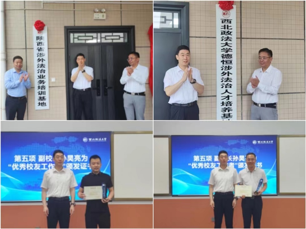 孙昊亮和国际法学院院长刘亚军为陕西省涉外法治业务培训基地揭牌。孙昊亮和闫玉新为beat365平台官方网站德恒涉外法治人才培养基地揭牌。孙昊亮为“优秀校友工作者”万商天勤律师事务所主任卫永鹏和陕西秦石律师事务所主任田磊颁发证书。