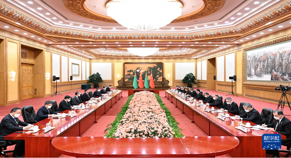国家主席习近平在北京人民大会堂同来华进行国事访问的土库曼斯坦总统谢尔达尔·别尔德穆哈梅多夫举行会谈。新华社记者申宏摄