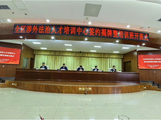 2024年4月25日,新疆维吾尔自治区全区涉外法治人才培训中心签约揭牌暨培训班开班仪式在乌鲁木齐举行。新疆维吾尔自治区党委常委、政法委书记陈明国、自治区党委政法委副书记吾买尔江-那买提,自治区司法厅党委书记刘建胜、副厅长谭磊,自治区高级人民法院副院长周志豪、张疆华,自治区人民检察院副检察长黄琳,联合国国际法委员会委员、外交部国际法咨询委员会主任委员黄惠康,青岛大学党委书记、中国-上海合作组织经贸法律服务研究院理事长肖江南,上海政法学院副院长、中国-上合组织国际司法交流合作培训基地办公室常务副主任罗立刚等领导出席揭牌仪式。来自新疆自治区高级人民法院、检察院、国家安全厅、兵团法院、兵团检察院、中国新疆自由贸易区乌鲁木齐片区、霍尔果斯片区、喀什片区,自治区司法厅、律师协会、贸促会和乌鲁木齐仲裁委员会等23个单位的一百余法律工作者参加培训。