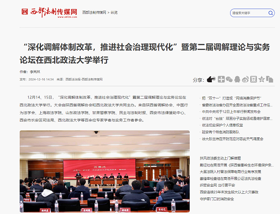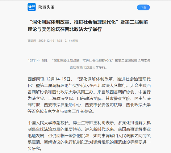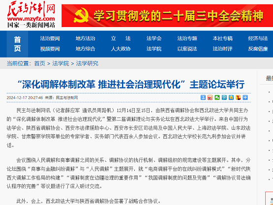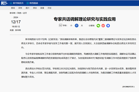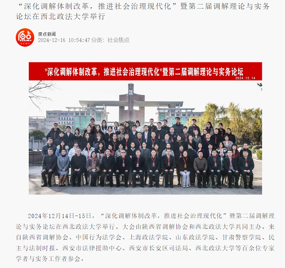 12月17日,人民网以《陕西省第二届调解理论与实务论坛在beat365平台官方网站举行》为主题进行新闻报道。新闻记者表示,在本次论坛上,多位专家围绕调解的热点议题,结合丰富的实务经验进行了深入剖析与探讨,共同为调解事业的进步贡献智慧与力量。