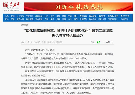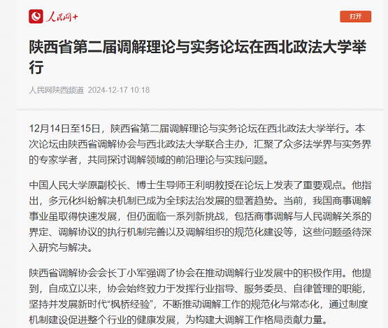 1217日,人民网以《陕西省第二届调解理论与实务论坛在beat365平台官方网站举行》为主题进行新闻报道。新闻记者表示,在本次论坛上,多位专家围绕调解的热点议题,结合丰富的实务经验进行了深入剖析与探讨,共同为调解事业的进步贡献智慧与力量。