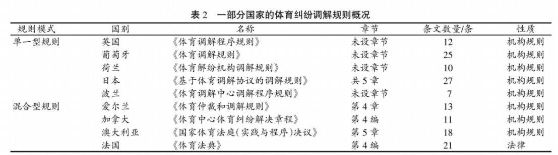 综观当今世界,在立法层面制定体育纠纷调解规则的国家甚为稀少,法国是世界上唯一一个以法典形式制定体育法的国家,其在《体育法典》中建构了属于该国的体育纠纷调解规则。而更多的国家则直接在体育纠纷调解机构中施行体育纠纷调解规则,将机构调解规则作为体育调解的直接适用依据。理由在于,调解是非正式性纠纷解决机制,通过效力层级更高的法律对其进行规制,不利于调解的灵活性,所以将调解规则直接适用于实施主体,以机构规则呈现,不受严格解释原则约束,可以有效地适应国际体育法律环境的变化,同时又符合调解程序的最低标准。业界惯于以条文数量判断各种法律文本的规模、长度或调整密度。表2中的部分国家制定的体育纠纷调解规则的条款数量就符合调解这一非正式纠纷解决机制的最低标准。其中:条文数量最多的是日本,有27条;最少的是波兰,有7条。条文最少并不意味着规则篇幅最短,如波兰体育纠纷调解规则中的每个条文均设有若干次级的条款。基于国家法律制度和现实需要,体育纠纷调解机构使用体育纠纷调解规则的模式呈现出多元化的特点,如表2所示,体育纠纷调解规则使用模式可以分为单一型和混合型2种模式。所谓单一型规则使用模式是制定单独的体育纠纷调解规则,英国体育纠纷解决机构、葡萄牙体育仲裁庭、荷兰体育纠纷解决机构、日本体育仲裁机构、波兰的体育调解中心主要使用该类规则。所谓混合型规则模式是将体育纠纷调解规则与其他相关法律混合在同一部法律或同一规则中,爱尔兰体育纠纷解决机构、加拿大体育纠纷解决机构及澳大利亚体育法庭主要使用该类规则,并且主要是将调解与其他替代性纠纷解决方式相结合,法国则将调解作为解决体育纠纷的特殊方式列入了《体育法典》。