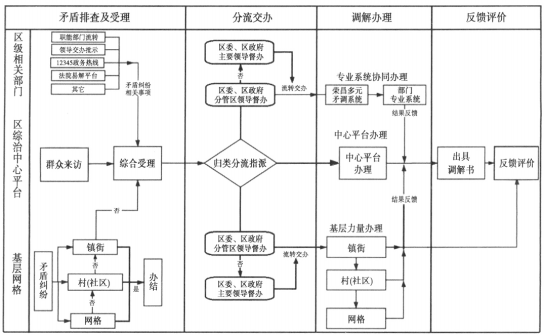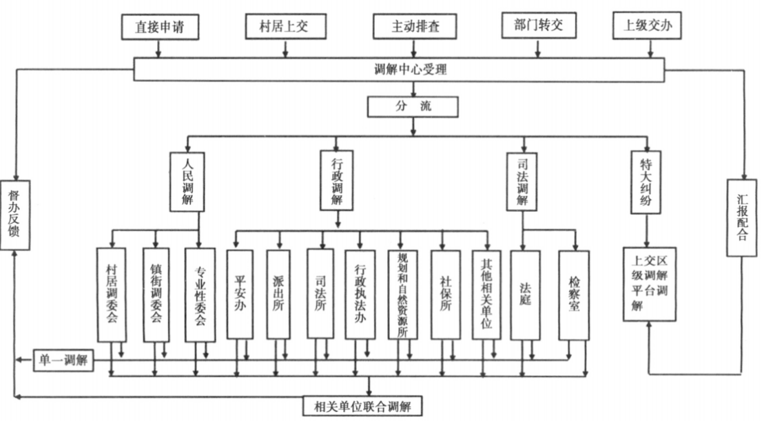 制度功能塑造组织结构。作为一项体现政党政治优势性和文化传承代表性的纠纷解决方式,多元调解“政治”(群众路线、公共参与)、“智治”(节约便利、长久和谐)、“自治”(自我管理、自我服务)、“德治”(贤达规劝、道德教化)、“法治”(规范奉示、以案释法)融合的复杂功能需要匹配多元互补、开放协同的网络组织结构。但是,长期以来,除人民调解有专门的组织机构(人民调解委员会)和组织成员(人民调解员),司法调解“可以由审判员和合同庭”主持开展外,实践中存在广泛需求的行政调解、大量涌现的如医疗纠纷调解、交通事故调解、劳动争议调解、金融消费纠纷调解等专业调解、行业调解、商业调解处于无法可依,且无章可循的散乱状态,这导致一方面,人民调解不断以政府购买和法律服务等形式被大量应用于解决各种制度缺失、突发应急和维稳等实际问题,“基层自治”“群众自治”的组织逻辑不断受到冲击,组织功能和组织边界日益模糊;另一方面,“行政吸纳服务”“行政吸纳社会”又导致调解的行政逻辑愈发突出,调解的多元性逐渐化为行政的条块性。行政条块的分割性、单向性、封闭性所产生的组织性耗散着多元调解的融合性、互动性、开放性所携带的组织活力。多元调解制度创新的主要目的是通过整合调解资源,再造调解组织,激发调解活力,发挥调解功能。合川、荣昌在“党委领导、政府负责”下,整合辖区内调解、综治、公安、信访、司法、网信等治理资源,依托“网格→村(社区)→镇(街道)→区”自下而上的综治组织体系,将“服务群众”“扎根基层”“便民利民”“开放综合”“联动联治”的综治工作优势与调解“政治”“智治”“自治”“德治”“法治”的多元组织需求结合,形成“网格(调解员)→村(社区)(调查会)→镇(街道(联调室)→区(综治中心/综合调处室)”纵向调解组织链条。通过专业调解、委托调解、派驻调解、特邀调解等方式,在横向上,建立调调对接的调解委员会,诉调对接、检调对接、警调对接、访调对接的调解(工作)室。通过调解员、调查会、联调室、调解(工作)室、专业调解委员会、一站式综合调处室等组织节点,人民调解与司法调解、行政调解、专业调解等其他调解形式互补联通,多元调解与“公”“检”“法”“司”“信”等其他解纷方式衔接互通。模糊散乱、条块分割的调解组织被纵横交错、开放协同的网络结构再造替换。