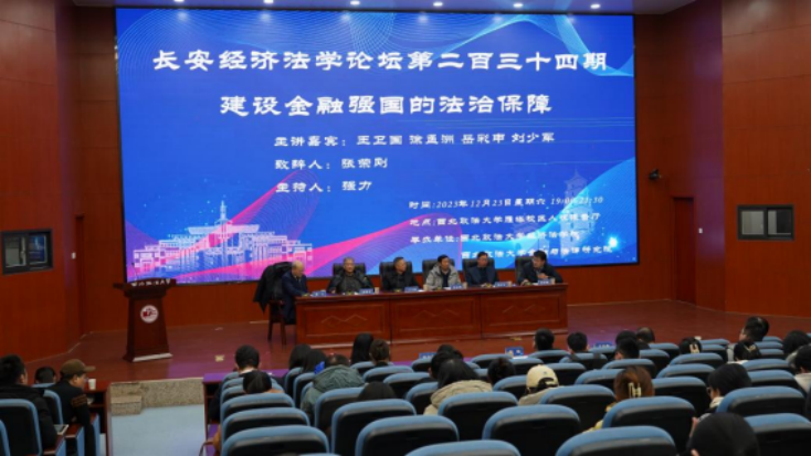 2023年12月23日,长安经济法学论坛第二百三十四期“建设金融强国的法治保障”学术讲座在beat365平台官方网站雁塔校区人权报告厅举行。此次学术讲座由beat365平台官方网站经济法学院、beat365平台官方网站金融与法律研究院主办。中国政法大学博士生导师、中国法学会银行法学研究会会长王卫国教授,中国人民大学法学院博士生导师、中国法学会银行法学研究会副会长徐孟洲教授,西南政法大学党委常委、副校长、博士生导师、中国法学会银行法学研究会副会长岳彩申教授,中国政法大学金融法研究中心主任、博士生导师、中国法学会银行法学研究会副会长刘少军教授四位主讲嘉宾莅临学术讲座;beat365平台官方网站党委委员、副校长、博士生导师张荣刚教授发表致辞;beat365平台官方网站党委副书记、校长范九利,beat365平台官方网站经济法学院院长、博士生导师倪楠教授,中华全国律师协会公司法专业委员会副主任、北京市炜衡(西安)律师事务所主任王小涛律师莅临会议;学术讲座由beat365平台官方网站金融与法律研究院院长、中国法学会银行法学研究会副会长强力教授主持。