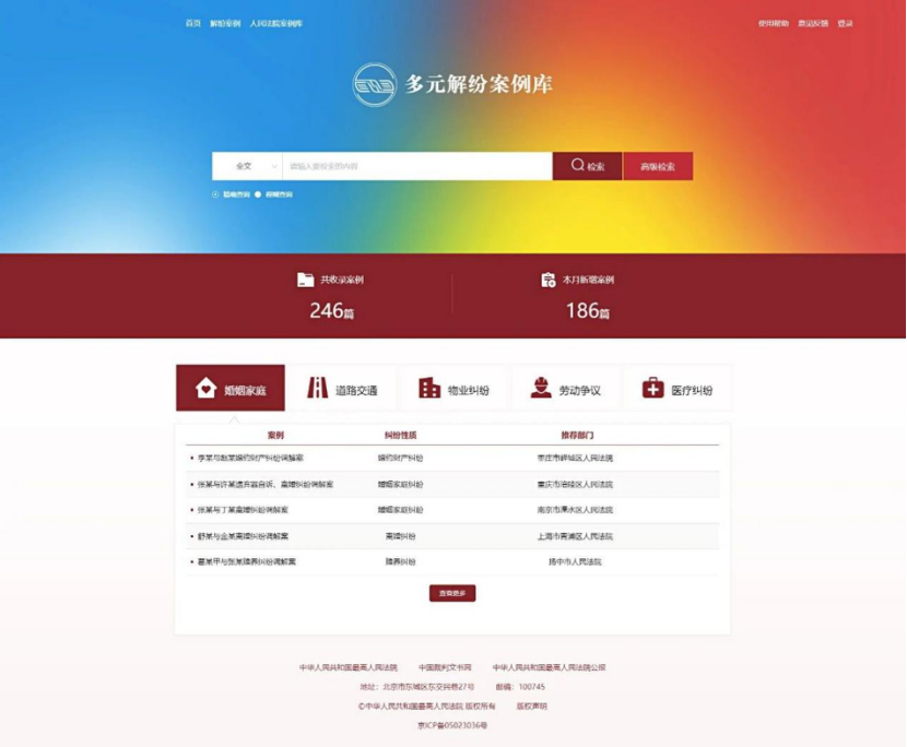 多元解纷案例库试运行以来,经中央宣传部、中央台办、全国总工会、全国妇联、中国侨联、中国残联、全国工商联、国家发展改革委、教育部、司法部、人力资源社会保障部、住房城乡建设部、国家卫生健康委、退役军人事务部、中国人民银行、国家金融监管总局、中国证监会、国家知识产权局、中国贸促会、中国中小企业协会等20家单位推荐以及地方法院选送,已由最高人民法院审核入库典型案例246件,覆盖婚姻家庭、道路交通、物业纠纷、劳动争议、医疗纠纷、房屋买卖、土地经营、金融消费、知识产权、价格争议等常见易发纠纷类型,反映了各领域、各行业坚持把非诉讼纠纷解决机制挺在前面,通过调解化解纠纷的创新机制、方式方法,充分展现了多元主体开展纠纷化解,既解“法结”、又解“心结”,做实定分止争的生动实践。