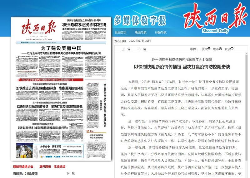本报讯 (记者 母家亮)7月5日,省长赵一德主持召开全省疫情防控视频调度会,听取西安市本轮疫情处置工作情况汇报,研究部署下一步重点工作。他强调,要深入贯彻习近平总书记重要讲话重要指示精神,认真落实全国疫情防控视频会商会要求,按照省委、省政府工作部署,以快制快阻断疫情传播链,坚决打赢疫情防控阻击战。省委常委、常务副省长王晓出席会议,副省长方光华通报有关情况。