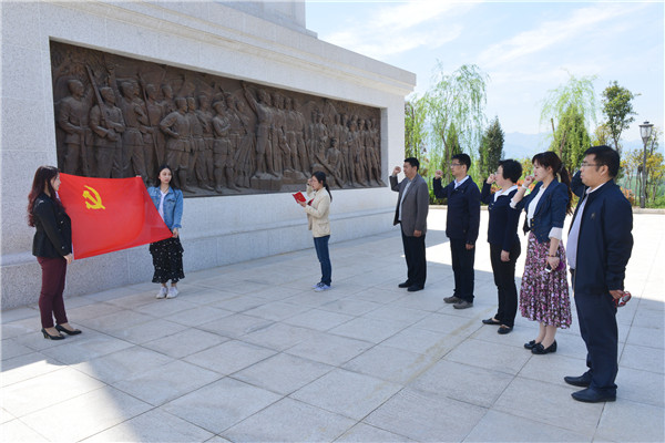 在渭华起义纪念碑前,支部全体党员面向党旗宣誓,重温入党誓词,缅怀革命先烈。