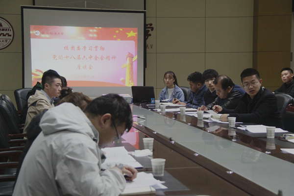 11月11日下午,校团委在图书馆一楼会议室举行学习贯彻党的十八届六中全会精神座谈会,校团委委员,校院两级学生组织负责人,科创、文艺骨干代表及部分青年学生参加座谈,校团委书记宋白主持会议。